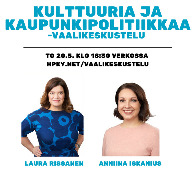 HPKY tulee järjestämään kaksi kulttuuria ja kaupunkipolitiikkaa käsittelevää vaalikeskustelua kesäkuussa käytävien kuntavaalien alla. Ensimmäiseen vaalikeskusteluun vieraaksemme saapuivat ehdokkaat Anniina Iskanius ja Laura Rissanen.