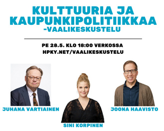>> 28.5. Kulttuuria ja kaupunkipolitiikkaa -vaalikeskustelu (Juhana Vartiainen, Joona Haavisto & Sini Korpinen)